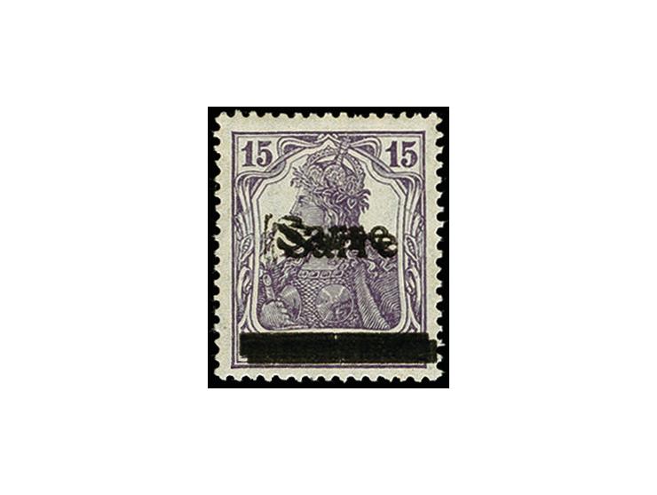 15 Pfg. schwärzlichgrauviolet mit Aufdruckfehler von Feld 89 "senkrecht geteilter Balken und Bogen des S oben gebrochen und zweites r in Sarre angeschnitten" außerdem "Druckspieß vor Sarre", sauber ungebraucht, oben ein verkürzter Zahn, sonst tadellos, sehr selten, vermutlich sind nur zwei Bogen mit kopfstehendem Aufdruck überdruckt worden, u.a. sign. Dub